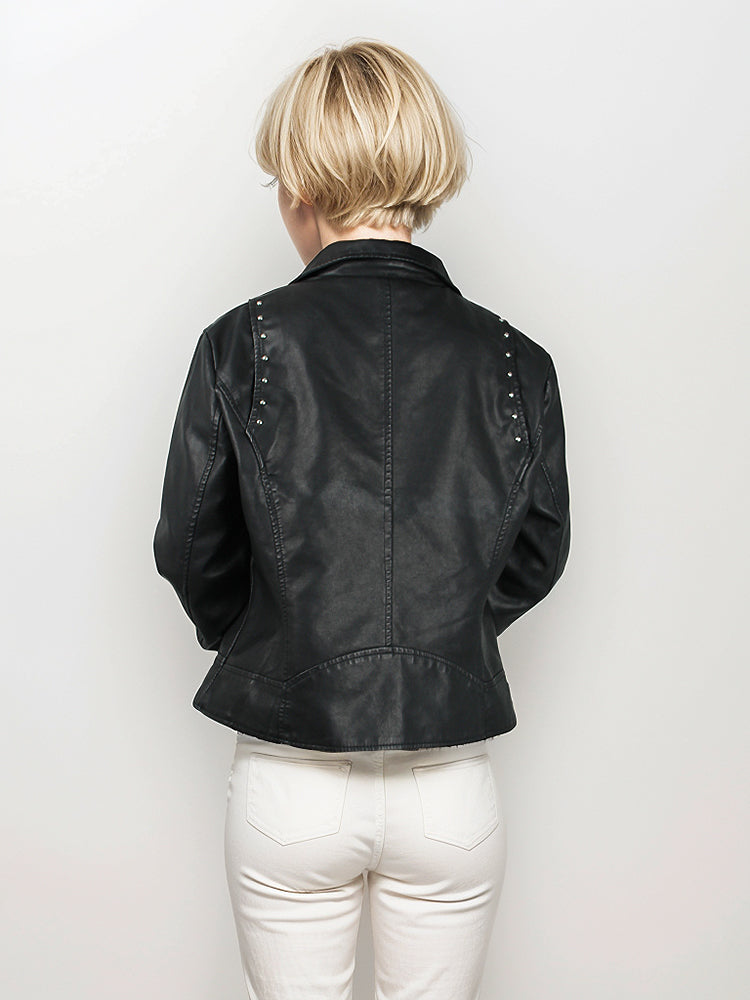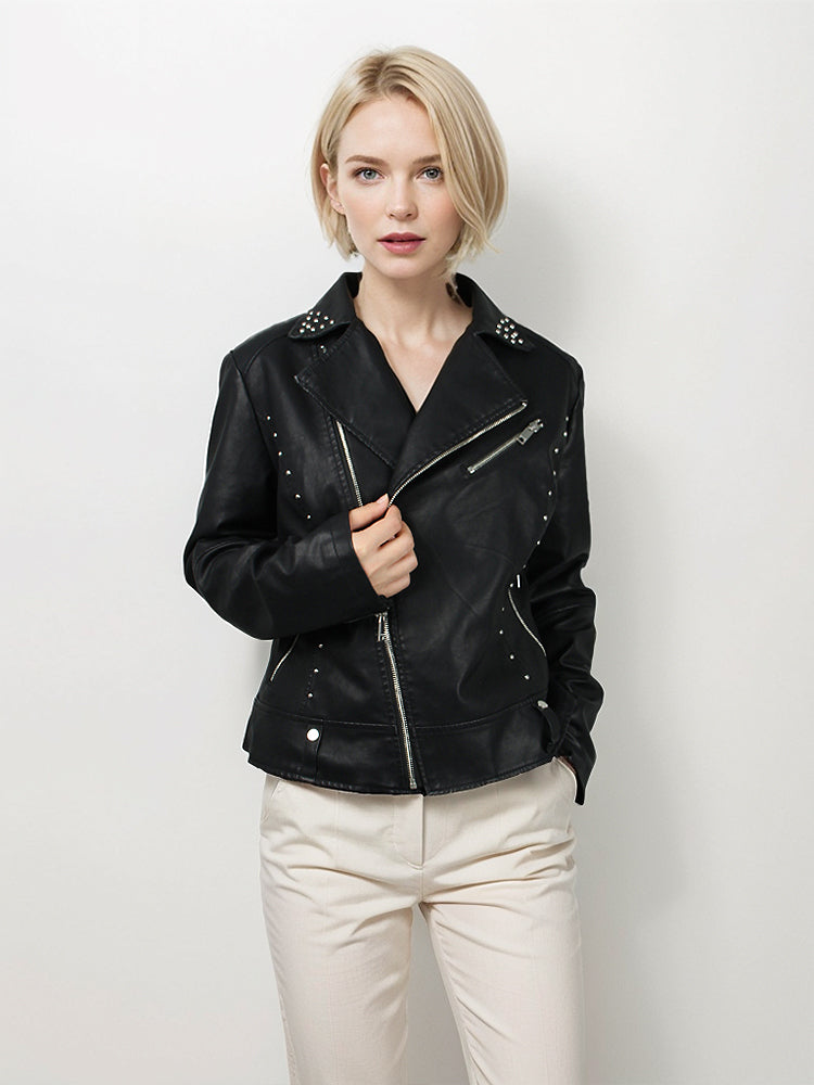 Short Collar Front and Rear Riveted Bottom Buckle for Women's Leather Jacket